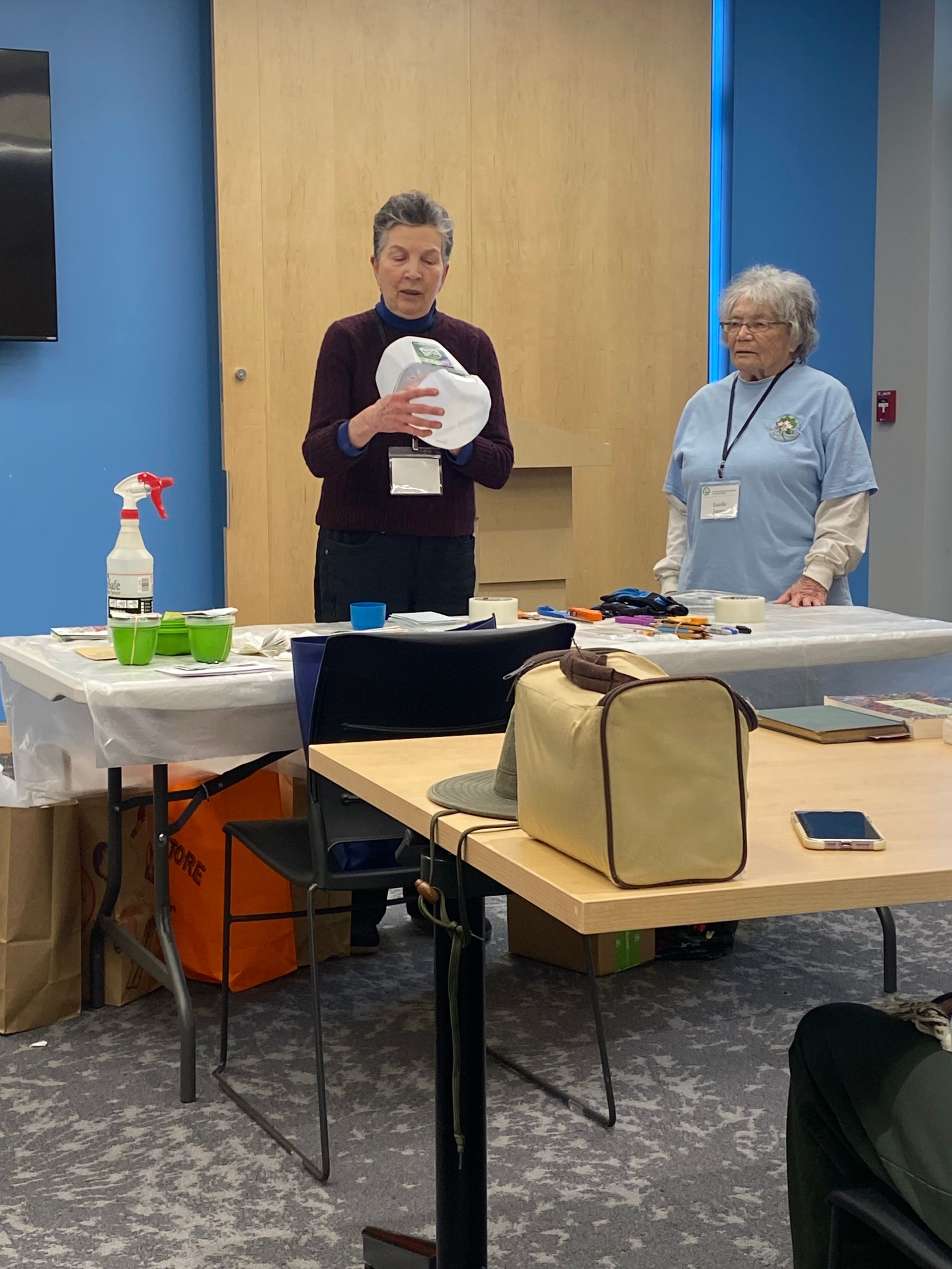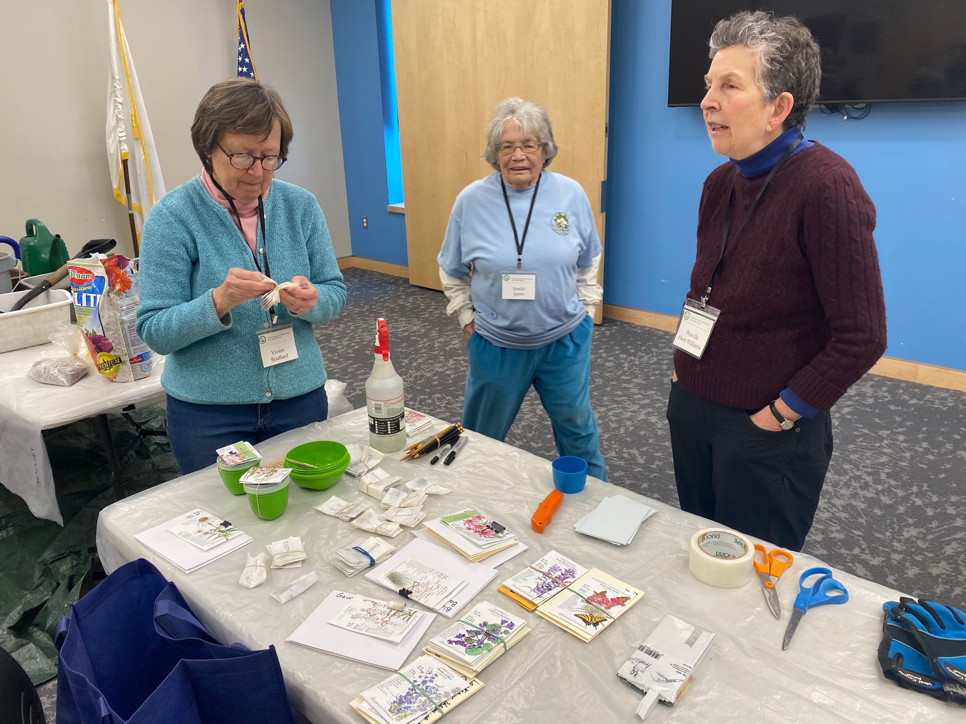 Vivien examines the NARGS Seed Exchange seed packets while Priscilla describes the steps for winter seed sowing.
